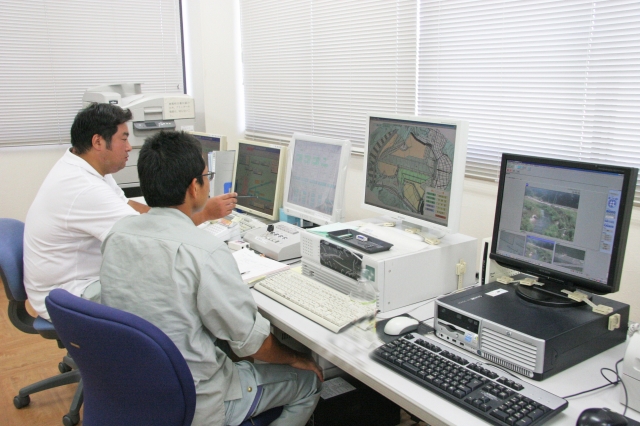 後谷ダム試験放流で協力してダムを操作する土地改良区と農業水利事業所職員=管理棟 (2010/08/10)