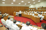市議会議場で「子ども議会」を行う鏡が沖中1年生。災害、産業など5つのテーマで市当局をただした=20日 (2010/07/21)