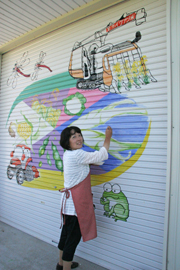 ライスセンターのシャッターに「営農の未来」を描く前沢美幸さん (2010/07/28)