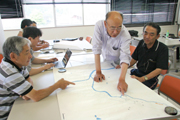 北条地区の防災マップ製作でパソコンと紙の地図に書き込む作業=22日、北条コミセン (2010/06/25)