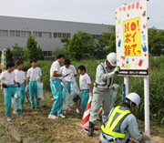 環境美化活動で国道沿いに看板を立てる美か西山中生徒=市内西山町黒部の駐車帯 (2010/07/01)