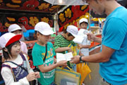 えんま市ガイドを務め、手作りパンフを渡す半田小4年生=市内東本町2 (2010/06/16)