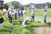 トンボのヤゴなどたくさんの水生昆虫が見られた有機栽培ほ場での研修=市内佐藤池 (2010/06/18)