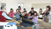 柏崎小の弦楽クラブ。指導は今春まで校長だった渡辺さん=同校音楽室 (2010/06/22)