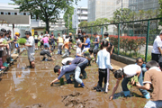 柏崎農協の指導で、校庭の一角にある学校田で稲の苗を植える東村山・南台小の5年生 (2010/05/22)