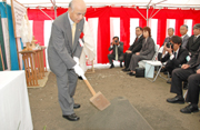 介護福祉施設「えみふる」の地鎮祭で、くわ入れを行うケンブリッジの橋本社長 (2010/05/27)
