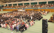 スーツや振り袖姿などで集まった新成人フェス。会田市長らから祝福を受けた=3日、市総合体育館 (2010/05/03)