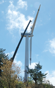 風力発電施設でのブレード取り付け作業=4月28日 (2010/05/06)
