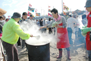 カラフルな大漁旗がなびく荒浜のイワシまつり。腕によりを掛けた浜汁が人気を集めた (2010/05/10)