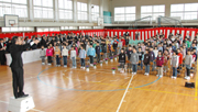 北条小開校式で、作詞・作曲の今成教諭の指揮で「北条賛歌」に声をそろえる参列者 (2010/04/06)