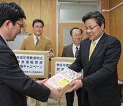 市内の各高校を訪ね、飲酒防止の生徒向けのチラシなどを渡す小売酒販組合の役員=柏高 (2010/04/08)