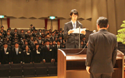 ブルボン入社式で吉田社長に決意を述べる新入社員=産文会館文化ホール (2010/04/01)