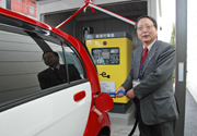 急速充電器の「お披露目式」で公用車のEVに充電する会田市長=2日、市役所駐車場 (2010/04/03)