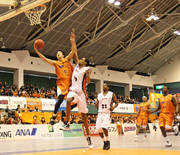 bjリーグの試合で速攻からシュートに持ち込む新潟の小菅直人選手=市総合体育館 (2010/04/05)