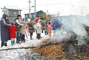 小正月の行事「さいの神」を行う中道町内会。威勢よく燃える火を大勢の人が囲んだ (2010/01/12)
