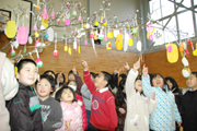 鯨波コミセンで、ミズキの枝に縁起物を付けてまゆ玉飾りを完成させた参加者 (2010/01/13)
