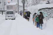 前日からの大雪の中を登校する児童たち=14日朝、市内日吉町 (2010/01/14)