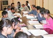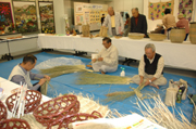 シニアじまん展でわら細工の実演を行う中鯖石地区のわさこき倶楽部=24日、ソフィア (2009/10/24)