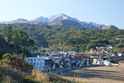 うっすらと雪化粧した米山=4日午前8時半ごろ、御野立公園から (2009/11/04)