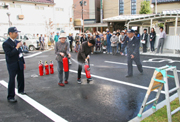 火災を想定して復興公営住宅で行われた訓練。消火器の使い方も学習=21日、市内駅前2 (2009/10/21)