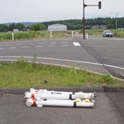8号バイパスで引き抜かれ、歩道に8本まとめて置かれたデリニエータポール (2009/09/18)