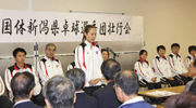 国体卓球の県選手団壮行会で決意を述べる山崎知春選手=市総合体育館 (2009/09/22)