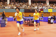 国体卓球少年女子の大阪戦ダブルスで、ジュースからポイントを挙げて喜ぶ王選手(左)ら (2009/09/30)