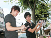 中心市街地から海岸方面へと車で移動しながら温湿度を測る工科大生=4日、市内諏訪町 (2009/08/05)