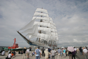 帆船「日本丸」のセールドリル。市民ら大勢が訪れ、優美な姿に魅せられた=8日午後、柏崎港 (2009/08/08)