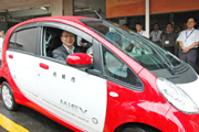 市の公用車としては第1号のEVの試乗を行う会田市長 (2009/08/10)