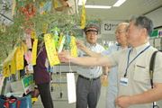 柏崎駅に飾られた七夕に、黄色の短冊をかける川口町のメンバー=2日午前