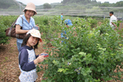 市内鯨波地内のブルーベリー園で実の摘み取りを楽しむ家族連れら