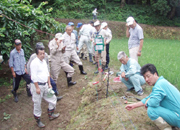 イノシシ被害防止の電気柵の張り方を研修する参加者=市内大平 (2009/07/08)