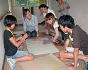 上米山小で、床の模様をクレヨンで描き取る児童、女子美大生ら (2009/07/09)