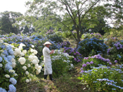 シンボルツリーのネムノキの周囲の斜面に広がる西山町荒谷のアジサイ (2009/07/10)