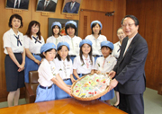 会田市長に手作りの国体記念品を渡すガールスカウト=11日、市長応接室 (2009/07/11)