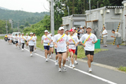 仮設住宅団地を走り抜けた「100キロマラソン」のランナー=市内西山町坂田 (2009/07/13)