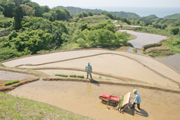 農業に参入し、日本海を望む棚田で田植え作業を進める吉原工業の社員=市内大平