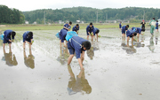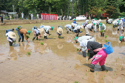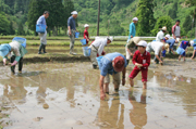 「山の子米」作りで地域の人たちと田植えに励む門出小の児童
