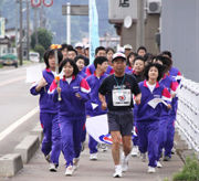 市民プラザをスタートし、中鯖石大運動会の会場に向かう炬火リレー=市内加納