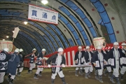 待望した椎谷岬トンネルの貫通を祝い、威勢良く通り初めを行うみこし (2009/04/22)