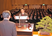 ブルボン入社式で吉田社長に決意を述べる新入社員=産文会館文化ホール (2009/04/01)