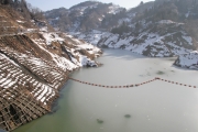 ダムの底に水がたまった栃ケ原ダム。左側が南向き斜面の右岸側で、雪がほとんどない (2009/02/06)