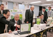確定申告の電子システムで入力する会田市長(手前右)、品田村長(同左)=柏崎税務署 (2009/02/16)