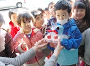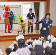赤鬼など3匹が登場した交通安全豆まき=3日、こみの保育園 (2009/02/03)