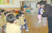 川崎市のグループが30日まで中越沖地震の被災地を励ますボランティア公演。愉快な腹話術に大喜びの園児たち=西本町2、明照保育園 (2009/01/29)