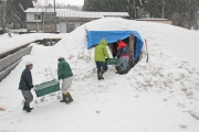コンテナを利用した貯蔵庫への米搬入。この後、雪をコンテナの上に積み上げた (2009/02/02)