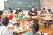 児童に囲まれ、教室でおいしそうに給食を食べる巨人軍の阿部選手(前列右から2人目)=柏崎小 (2008/12/05)
