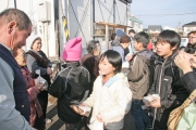 自分たちで栽培したサトイモを仮設住宅で贈る南鯖石小の児童 (2008/12/10)