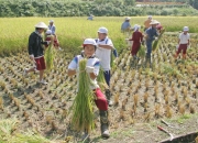 「山の子米」の稲刈りをする門出小児童たち=16日 (2008/09/18)